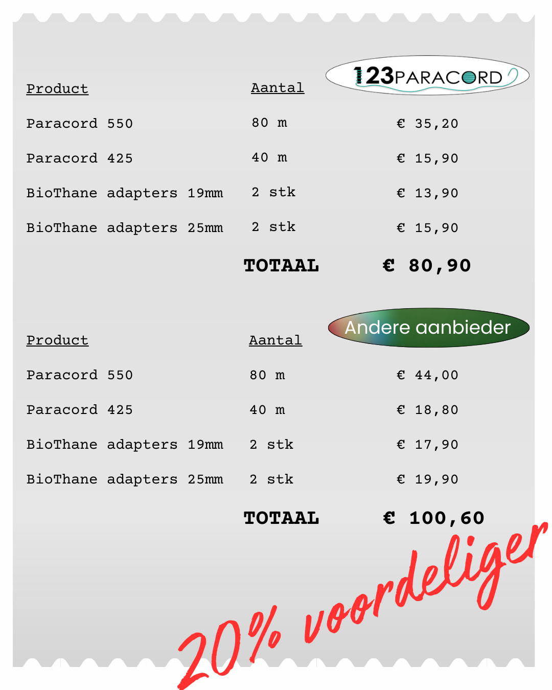 Daarom hebben wij een identieke winkelwagen samengesteld en vergeleken met een andere grote Europese aanbieder van Paracord en toebehoren. Met deze vergelijking willen we je graag laten zien waarom het verstandig is om voor 123Paracord te kiezen en waarom steeds meer knopers dit al doen. Niet alleen onze prijzen zijn vaak 15-20% voordeliger, er zijn nog een aantal belangrijke verschillen.