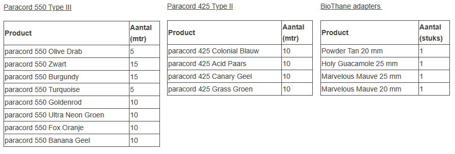 In de vergelijking tussen 123Paracord en een andere grote Europese aanbieder hebben wij exact dezelfde aantallen en producten gebruikt, zodat er een eerlijke vergelijking is. Je vind hier ook gelijk de directe links naar deze pagina's, zodat je de gewenste kleuren aan je winkelwagen kunt toevoegen en zelf een vergelijking kunt maken: